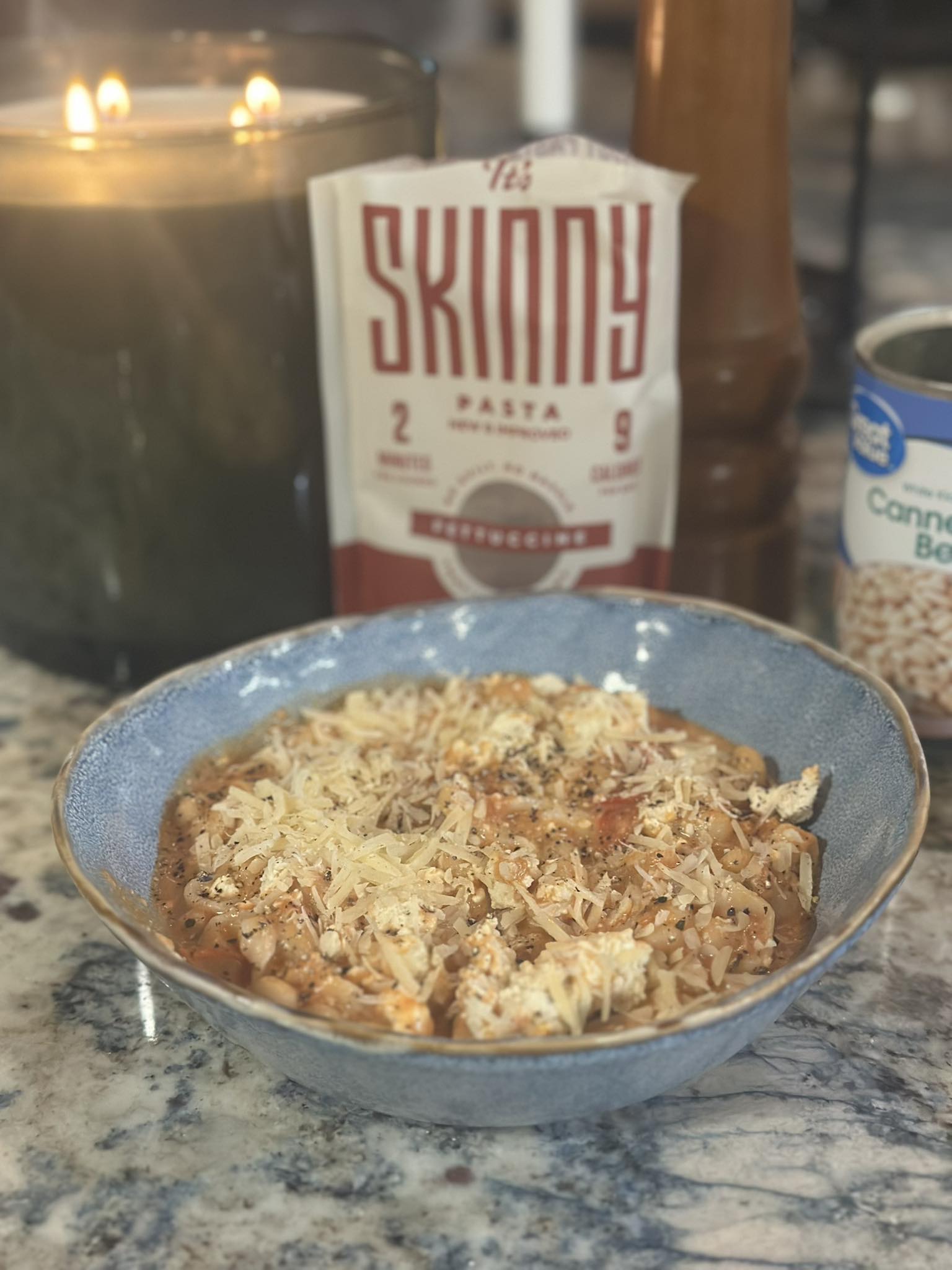 When I reheated the sauce today… I added a can of cannellini beans and some cottage cheese and cooked it down. Then added one whole bag of “it’s Skinny” Fettuccine. If you have never tried this stuff/ you are missing out. The entire bag has only 9 calories. No joke!!! And… you don’t boil it. Just add the pasta directly to your sauce from the bag so it get’s hot and absorbs the flavors. Almost no caloires and super fast to prepare!!! We love ity. And no, I am not an affiliate for the brand either. Just plain ole’ good word of mouth sharing.